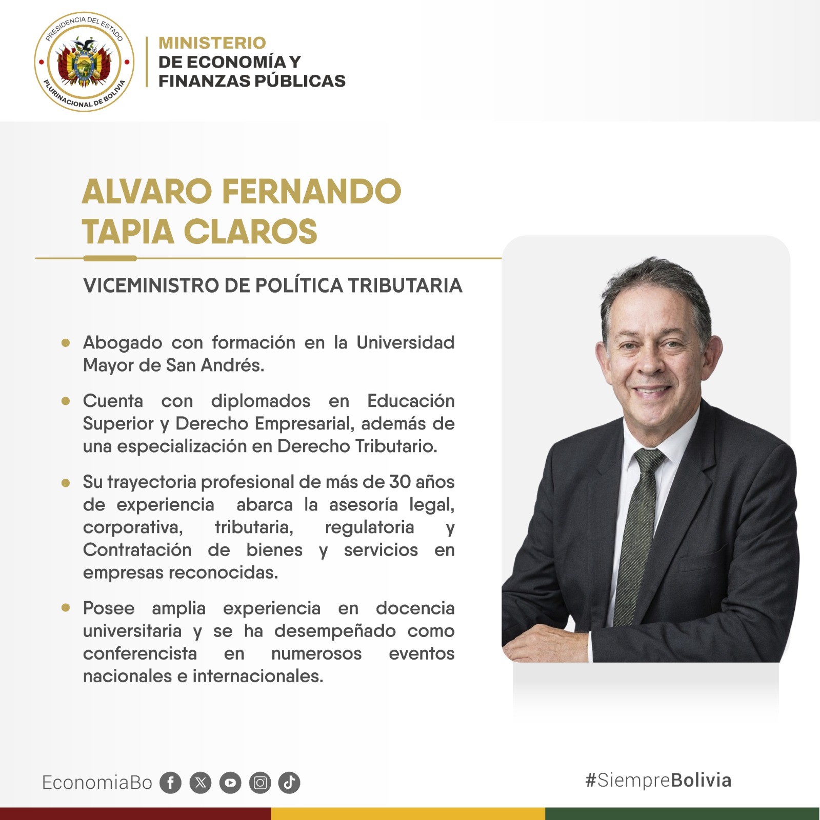 El Ministerio de Economía y Finanzas Públicas designó a Álvaro Fernando Tapia Claros como Viceministro de Política Tributaria, quien asume esta responsabilidad con el compromiso de impulsar una transformación profunda del sistema tributario boliviano. El objetivo es claro: dejar atrás el “infierno tributario”, simplificar los procesos, ampliar la base de contribuyentes y brindar certidumbre a la ciudadanía, a los productores y a los profesionales independientes. Mediante el Decreto Supremo 5503, se avanza en medidas concretas como la facilitación tributaria, el perdonazo, el reconocimiento del crédito fiscal para productos Hecho en Bolivia y la formalización de la economía, bajo un enfoque justo, transparente y responsable. El mencionado es miembro destacado del Instituto de Boliviano de Estudios Tributarios.